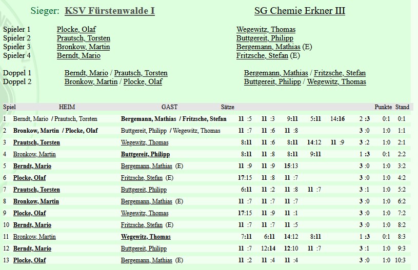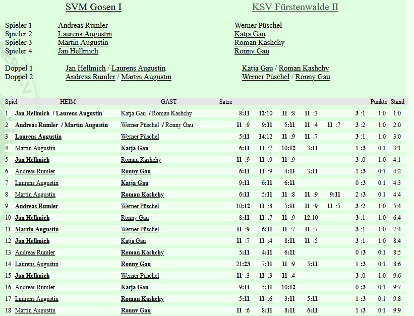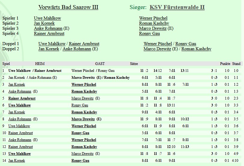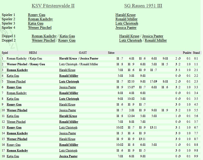 Das hätte ein Sieg werden können. Bis zum 5:5 blieb es ausgeglichen. Dann haben es Ronny, Roman und Werner offensichtlich gereicht und holten Punkt für Punkt bis zum 6:9. Katja hattes in der Hand, den Siegpunkt zu holen. Doch leider war dieser Abend wohl nicht ihr Tag.