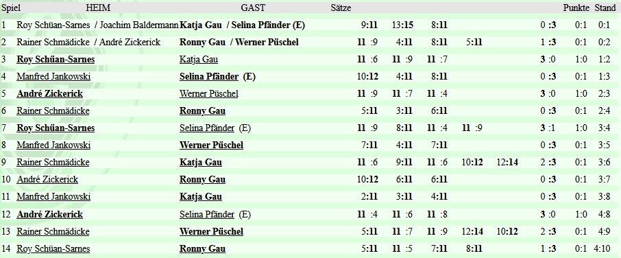 Zum zweiten Auswärtsspiel der Saison stand im Vorfeld fest, dass Roman leider nicht konnte. Da wir, wie das Ergebnis zeigt, auch in der 3. Mannschaft sehr gute Spieler haben… ging die 1. Anfrage an Selina, welche auch prompt an diesem Tag konnte. Daraus ergaben sich neue Doppelkonstellationen und erstmalig die Trainerin/ Spielerin-Kombination: Katja/ Selina – was offensichtlich die richtige Entscheidung war und zu einer 2:0 Führung führte. Die weiteren 6 Einzel waren noch recht ausgeglichen, aber weiterhin mit der 2-Punkte-Führung (5:3) für den KSV II. Da kam der Durchbruch… offensichtlich fast zu spannend für die eigenen Teammitglieder, die von der Bande mitfieberten. Obwohl Rainer Schmädicke schon mit 2:1 gegen Katja führte, konnte diese auf 2:2 ausgleichen und einen Spielstand von 7:10 noch in ein 14:12 umwandeln und damit auf eine 6:3 Führung ausbauen. Zwei weitere sichere Punkte folgten auf ein 8:3… der Sieg war in Sicht! Nach dem Selina bereits zuvor einen souveränen Sieg eingeholt hatte und anschließend leider, in einem technisch und taktisch guten Offensiv-Spiel, gegen Roy Schüan-Sarnes unterlag, war der Materialspieler André Zickerick für sie noch (aber auch für Werner und Katja) nicht zu knacken – 8:4. Mit einem kleinen Stolperer holte Ronny noch vor Werner, den 9. Punkt. Werner drehte ebenso wie Katja zuvor das Spiel gegen Rainer Schmädicke im Entscheidungssatz in der Verlängerung zugunsten des KSV II und holte damit rechnerisch den Siegpunkt zum 10:4.