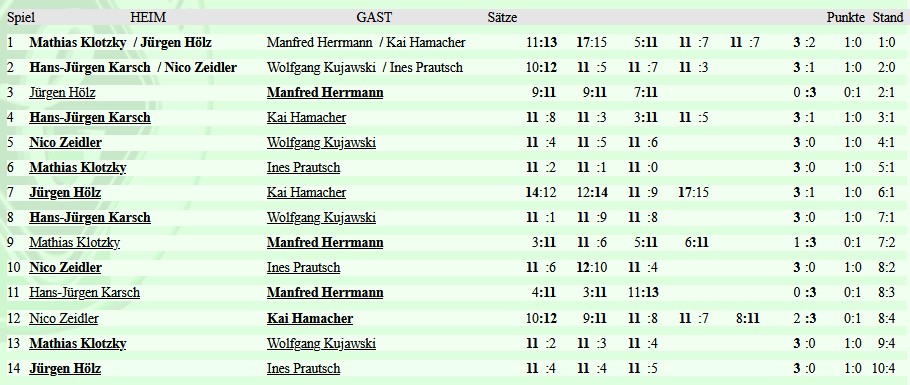 Manfred war hier der überragende Punktebringer. Kai kämpfte nach dem Ausgleich seiner 2:0 Führung wieder ins Spiel zurück und holte den Punkt. In zwei weiteren Spielen war ebenfalls Potenzial für einen Punkt. Da muss der Kai wohl mal wieder häufiger zum Training kommen, nicht nur zum Punktspiel 😉.